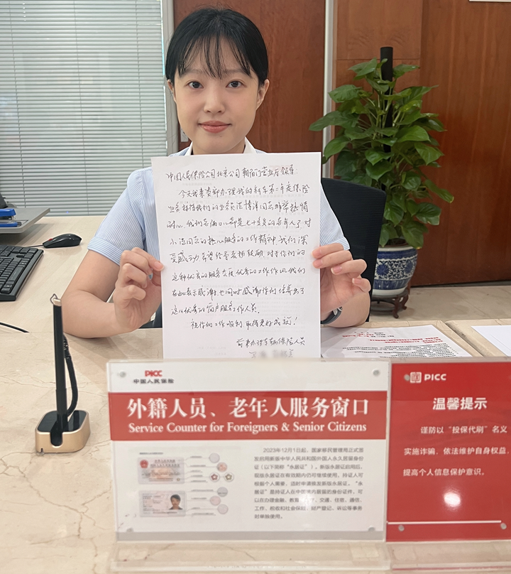 从险种比对到最终签字确认,出单人员始终耐心细致化解老人的每一处疑问,最终让老人购买到了合适的保险。"这孩子像自家孙女一样亲切!"老人在感谢信里写到:"在智能时代还能享受到这么贴心的传统服务,实在难得。" 这封感谢信背后,是人保财险北京分公司长期推进适老化建设的缩影:设立"银发专属窗口"、配备老花镜、急救药箱等适老设施、开通“绿色通道”,优化服务细节,让老年客户跨越“数字鸿沟” 。